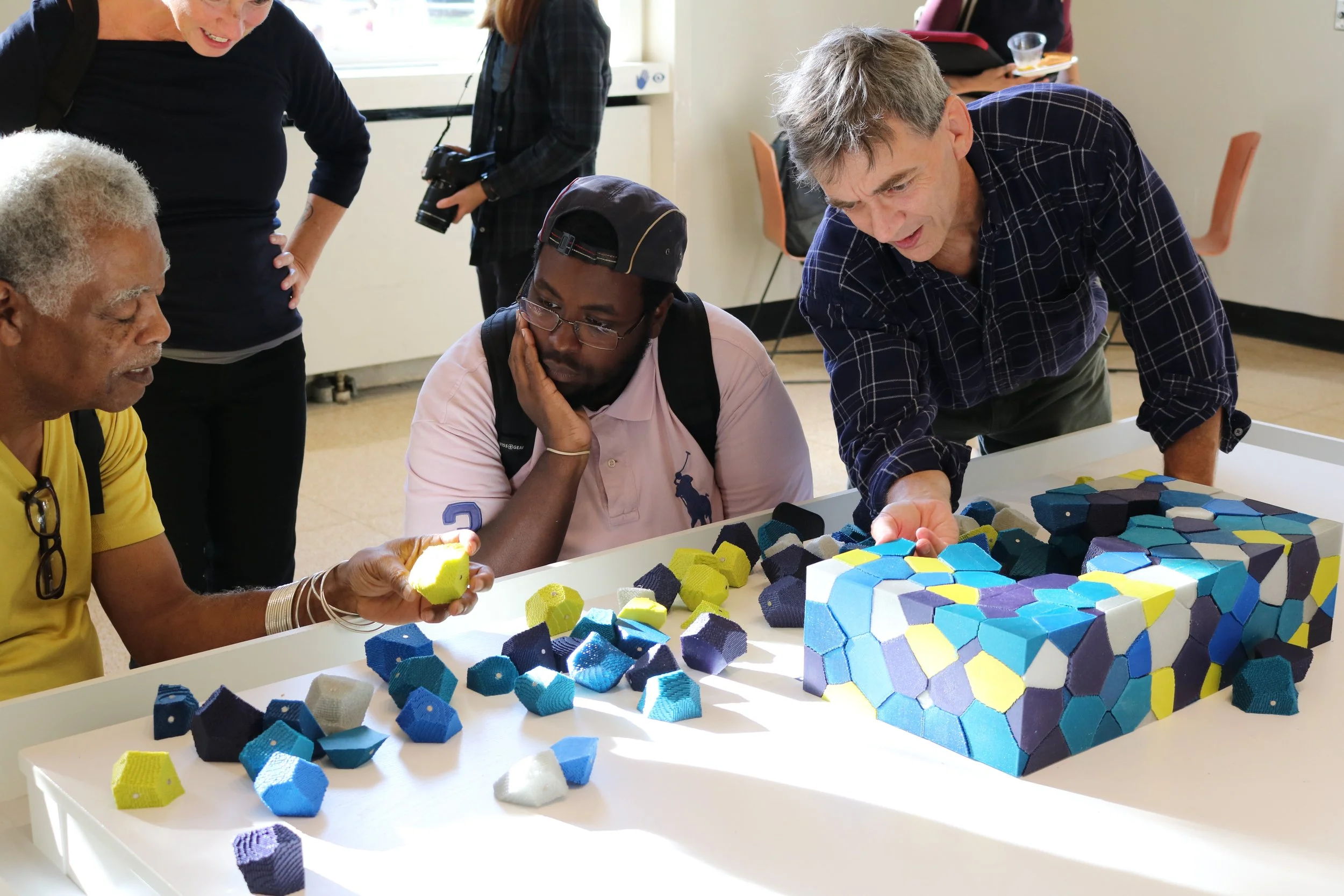The main feature of the exhibition was the Impossible Puzzle, a 3d printed and magnetized puzzle based on the grain boundaries of copper. The challenge is to reconstruct the material sample (a rectangular solid) from the pile of 274 grains (aka puzzle pieces).